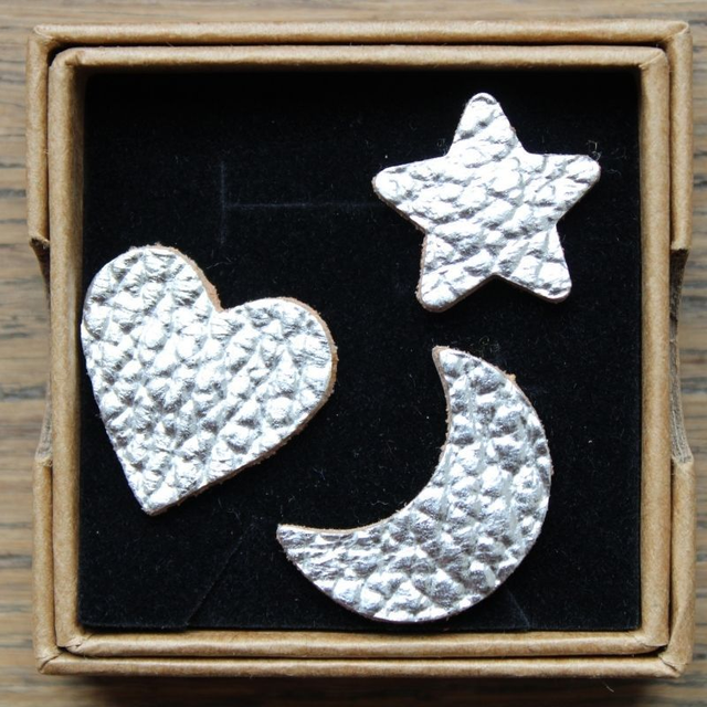 Agrémentez votre veste, un sac ou un col avec ces 3 petites broches en cuir. Ces pin's sont réalisés à partir de chutes de cuir de mon atelier. Cuir de vachette argenté.