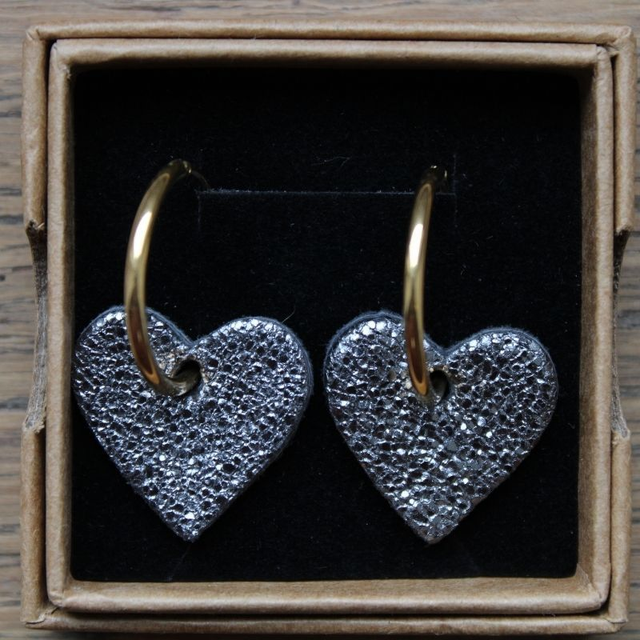 Boucles d’oreilles créoles cœur en cuir de chèvre gris pailleté