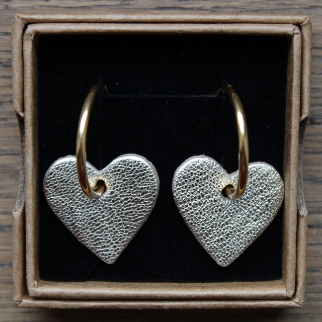 Boucles d’oreilles créoles cœur en cuir de chèvre or blanc