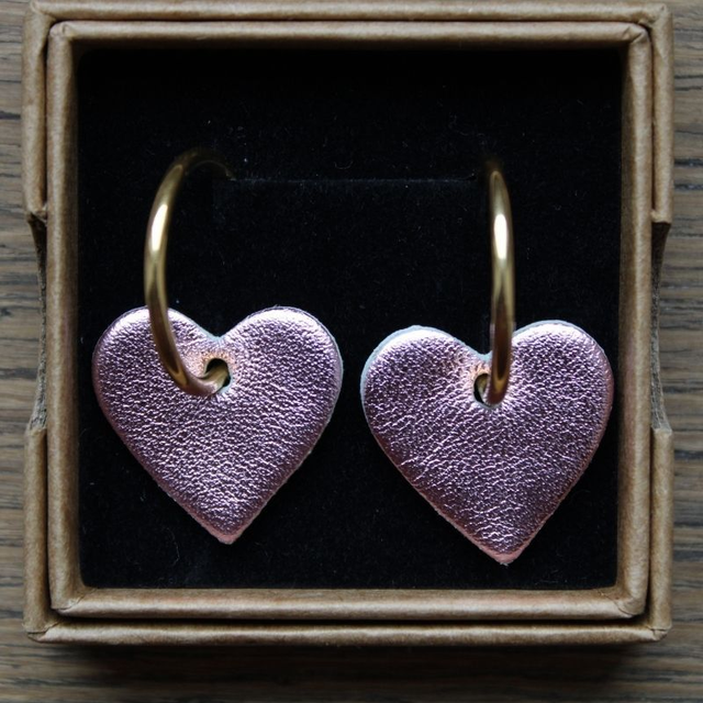 Boucles d’oreilles créoles cœur en cuir de chèvre rose métallisé