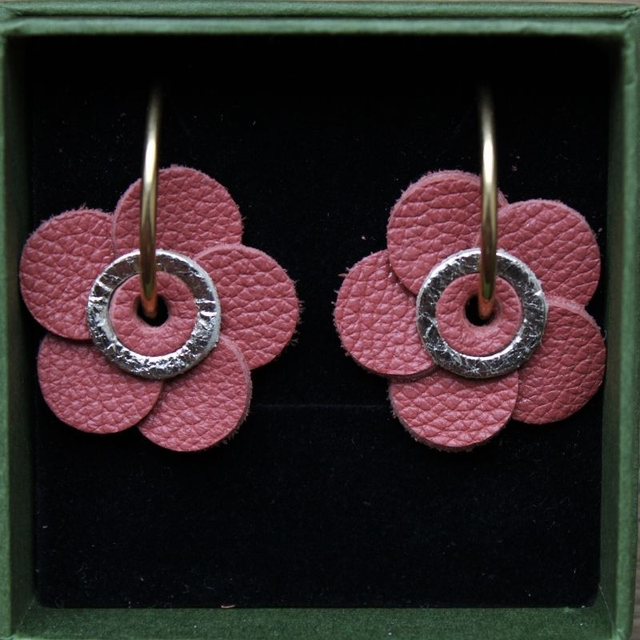 Créoles en acier inoxydable doré de 28 mm, avec pendentif fleur en cuir bois de rose de 32 mm. La fleur est réalisée à partir de chutes de cuir de mon atelier. Bijou léger et coloré.