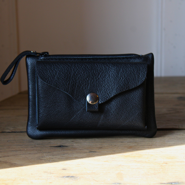 Petite pochette multifonctions conçue pour emporter avec vous tout l'essentiel. Comprend un grand compartiment zippé faisant office de porte monnaie. Sur le devant, une pochette en volume prévue pour accueillir CB, cartes de visites, et autres cartes en tout genre. Se ferme grâce à un bouton pression argenté, et camoufle derrière elle une poche plaquée du même format. Au dos, retrouvez une seconde poche plaquée adaptée aux dimensions du permis de conduire (format papier rose) et carte d'identité.