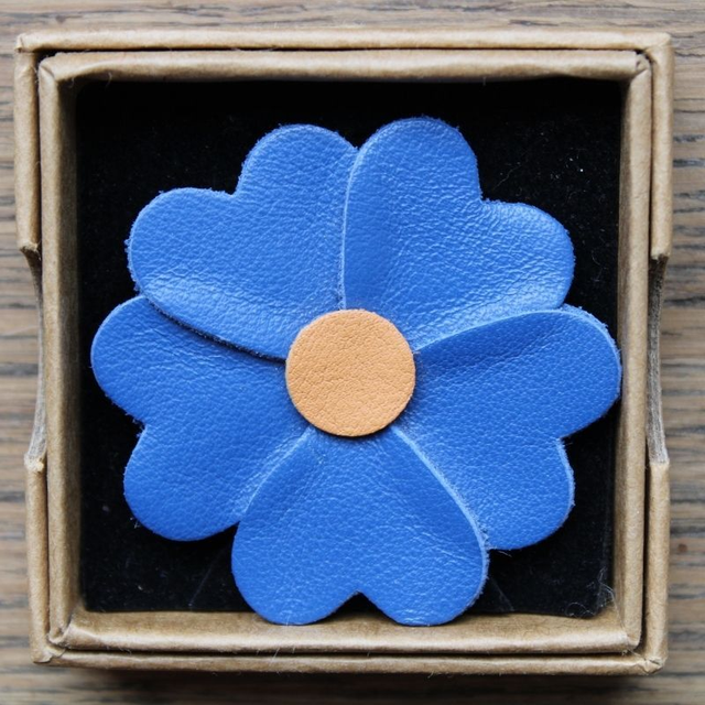 Broche en cuir bleu de 45 mm. La fleur est réalisée à partir de chutes de cuir de mon atelier. Agrémente une veste, un sac ou un col.
